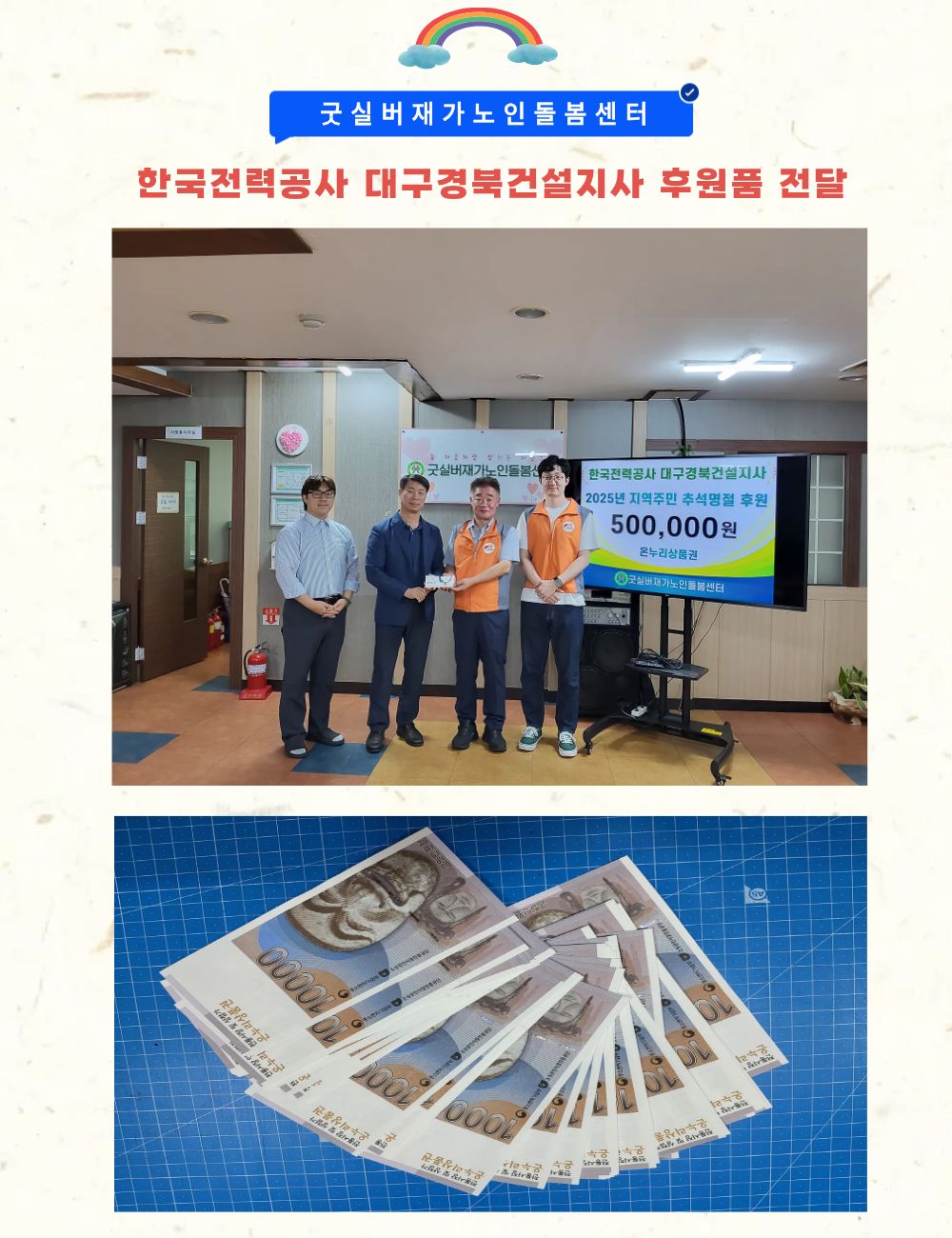![]() Çѱ¹Àü·Â°ø»ç ´ë±¸°æºÏ°Ç¼³Áö»ç¿¡¼ º» ¼¾Å͸¦ ¹æ¹®ÇØ Ãß¼®¸íÀýÀ» ¾ÕµÎ°í Àç°¡¾î¸£½Å¿¡°Ô ÇÊ¿äÇÑ ¹°Ç°À» ±¸ÀÔÇØ ÀüÇØ ´Þ¶ó°í ¿Â´©¸®»óǰ±Ç 50¸¸¿øÀ» ÈÄ¿øÇØ Áּ̽À´Ï´Ù. À۳⿡ ÀÌ¾î ¿ÃÇØµµ ¹æ¹®ÇØ ÁֽŠÇѱ¹Àü·Â°ø»ç ´ë±¸°æºÏ°Ç¼³Áö»ç ÈÄ¿øÀÚ´Ô¿¡°Ô ´Ù½Ã ÇÑ ¹ø °¨»çµå¸³´Ï´Ù. | |||