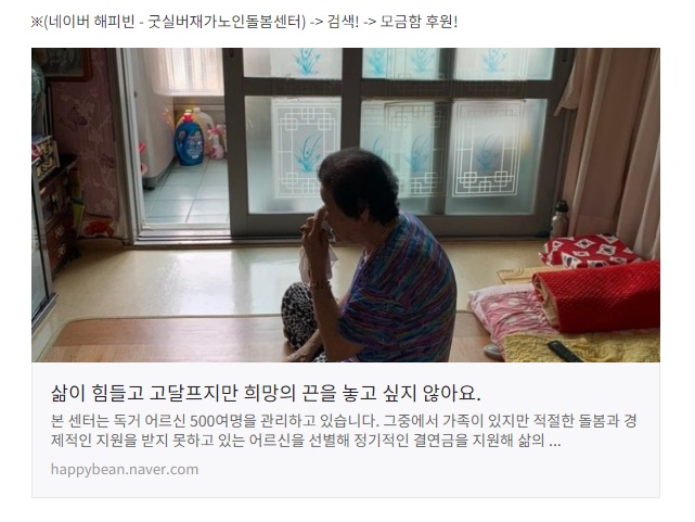 ¡Ø(³×À̹ö ÇØÇǺó - ±Â½Ç¹öÀç°¡³ëÀε¹º½¼¾ÅÍ) -> °Ë»ö! -> ¸ð±ÝÇÔ ÈÄ¿ø! https://happybean.naver.com/donations/H000000173646